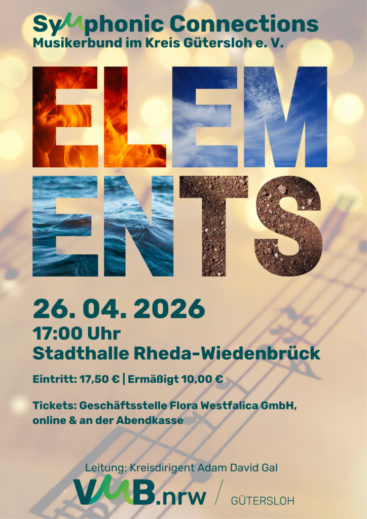 Start des Projektorchesters Gütersloh am 24.01.2026 und Abschlusskonzert am 26.04.2026 in der Stadthalle Rheda-Wiedenbrück unter dem Motto „Elements“